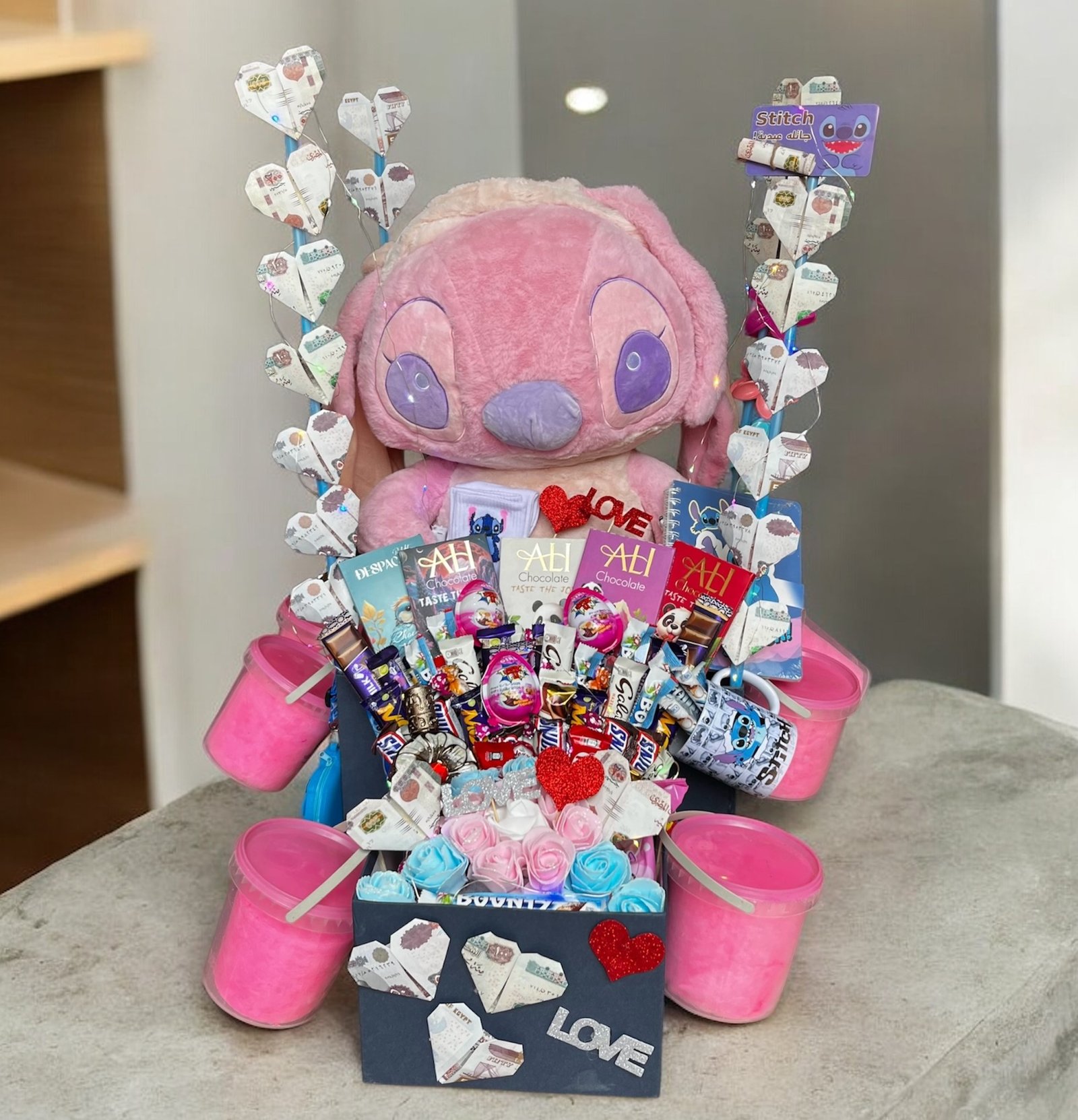 • تشكيلة شوكولاتة فاخرة: باقة متنوعة من أشهر الأنواع (Galaxy, Snickers, Kinder, Bounty) بالإضافة إلى ألواح شوكولاتة “Ali” بتصاميمها الملونة.